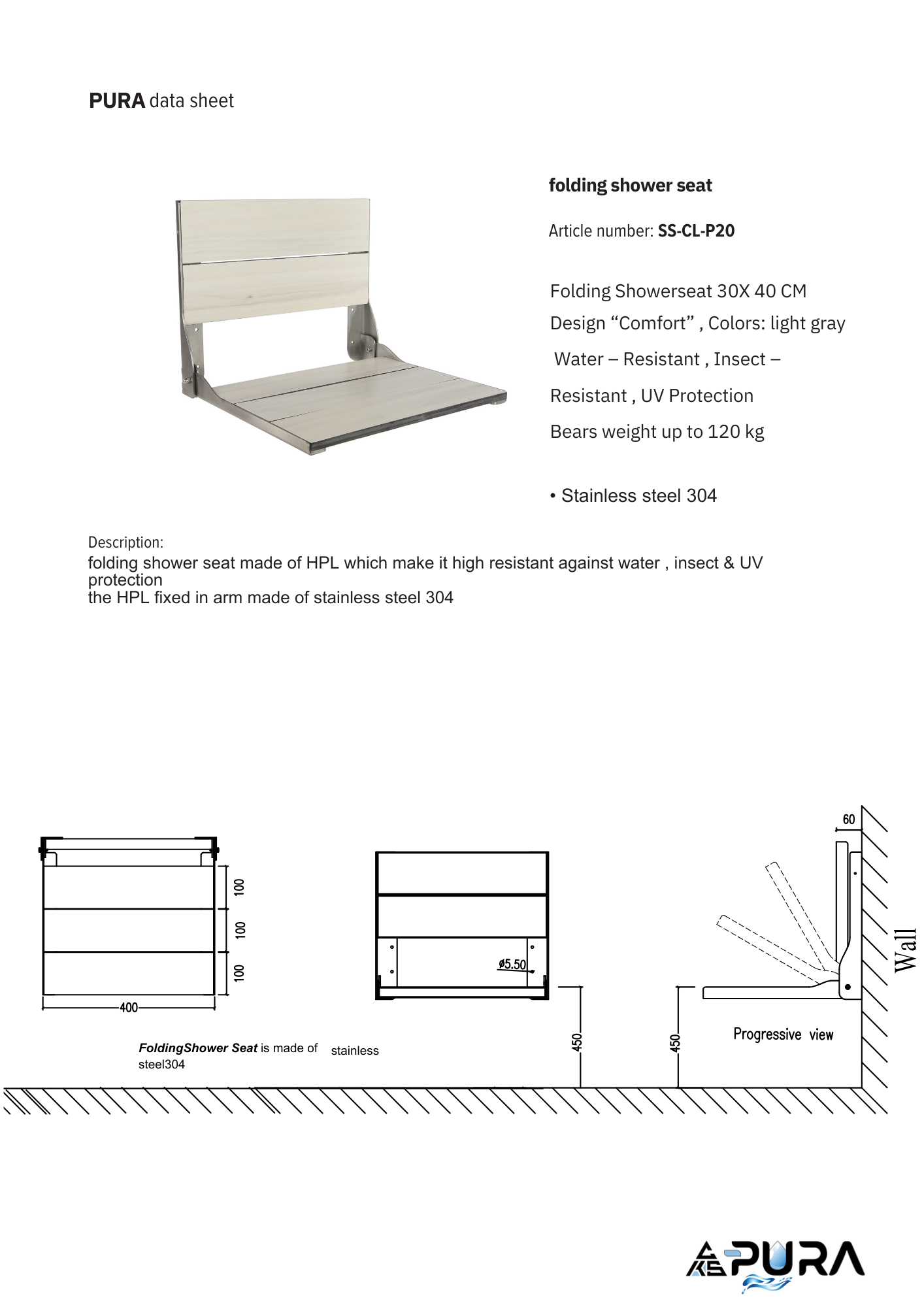 تصميم مريح وعملية عالية، بقاعدة وظهر من خامة HPL Compact المقاومة للمياه والخدوش والحرارة، مع شاسية استانلس ستيل 304 القابل للطي. عملي وقوي، يتحمل لحد 120 كجم، ويديك راحة وأمان أثناء الاستحمام.